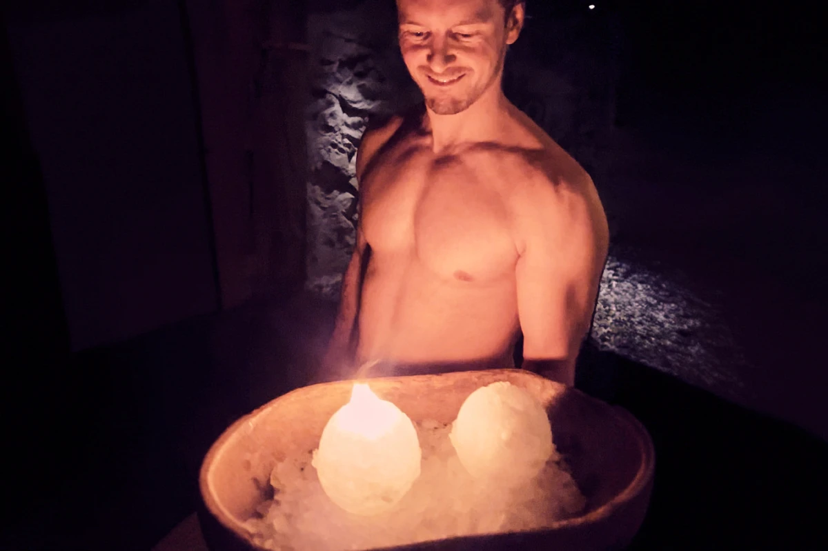 Passt doch! Loses Eis, Eiswasser oder Schneebälle aus Eis sorgen für einen besonderen „Frischekick". Die Intensität steigt und kann auch den erfahrenen Saunagänger zum Schmelzen bringen.